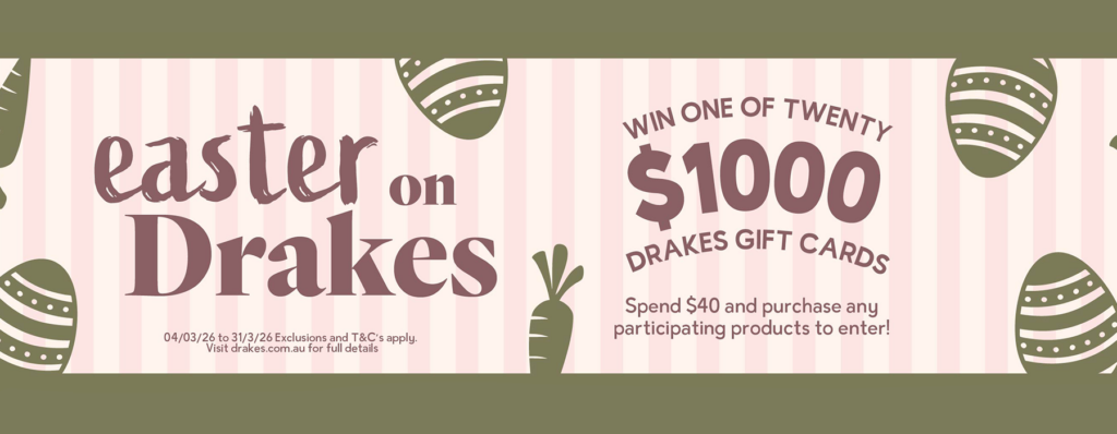 Win one of twenty $1,000 Drakes Gift Cards! Simply spend $40 and purchase any participating product in the one transaction to enter!  Total prize pool $20,000. Promotion runs from Wednesday 4th March 2026 to Tuesday 31st March 2026.  Exclusions and T&C’s apply. View the full terms and conditions here.